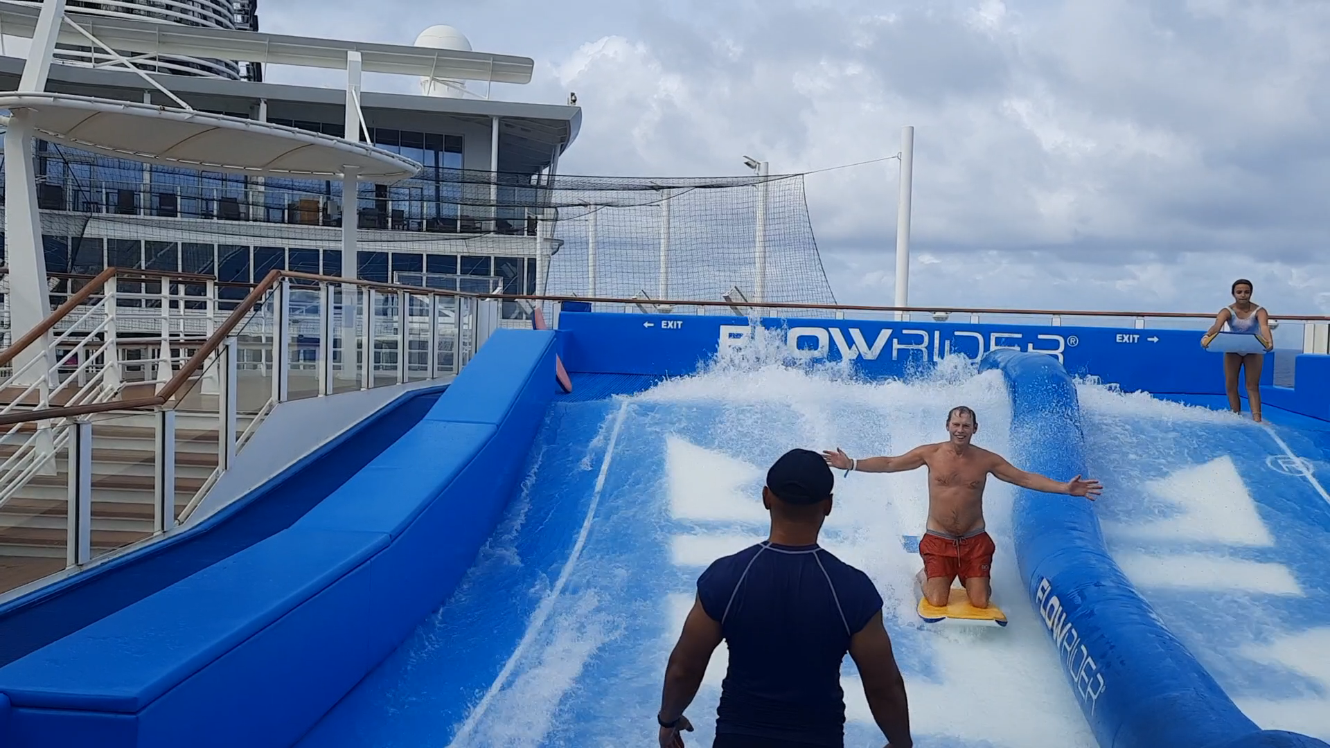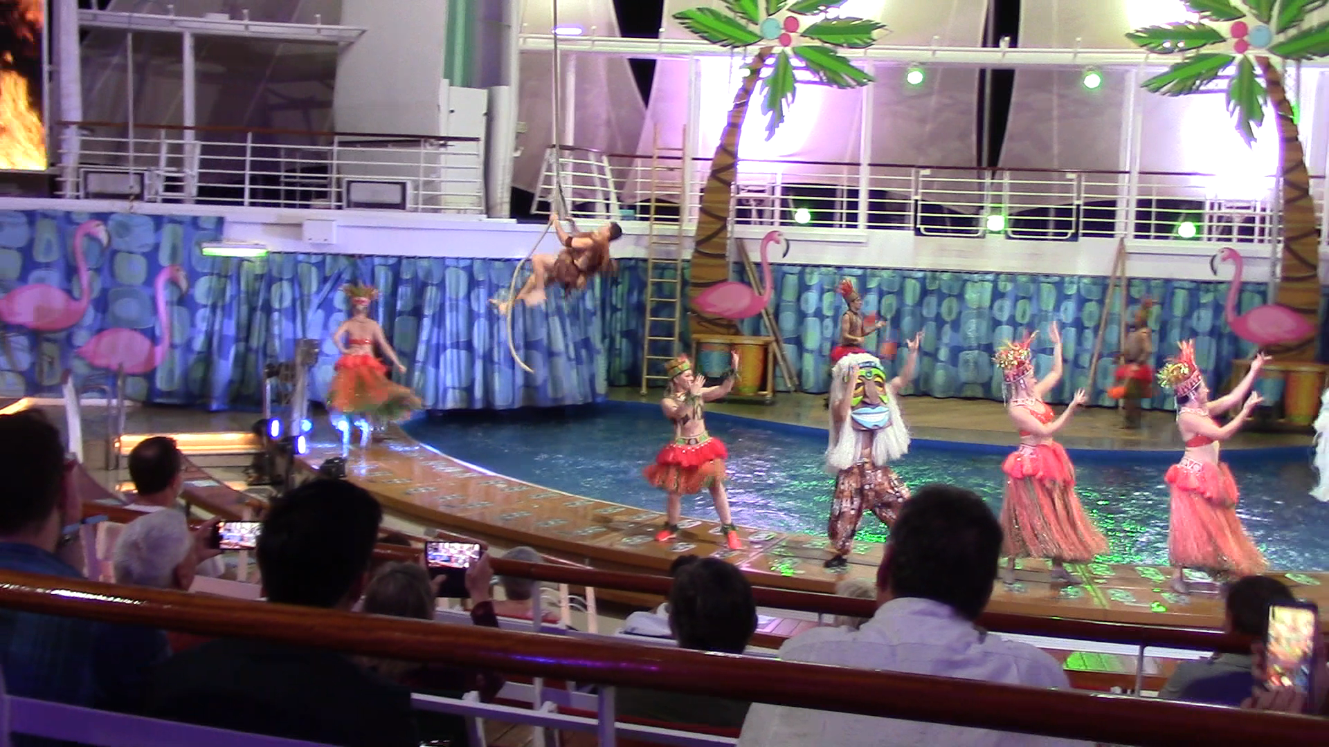 Crazy suit guy and his lady divers in the Aquatic Show.Tarzan swinging over the dancers.Really great singing group. They did Queen’s Bohemian Rhapsody, among other classic hits.Mike, up on the board in the Flow Rider!!